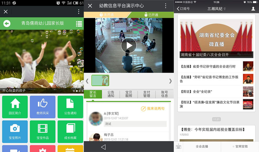 是将实时视频通过微信页面进行直播,并支持视频点播的整体解决方案。可实现将监控设备(DVR、DVS、3G/Camera、硬件编码)的视频流转换为适合移动设备直播播放的媒体格式;可支持各种移动设备的监控视频直播访问服务;支持视频录制服务,视频回放功能; 支持各个厂家平台对接,可接入第三方视频监控平台;支持视频页面通过微信平台进行好友分享和朋友圈分享传播。
